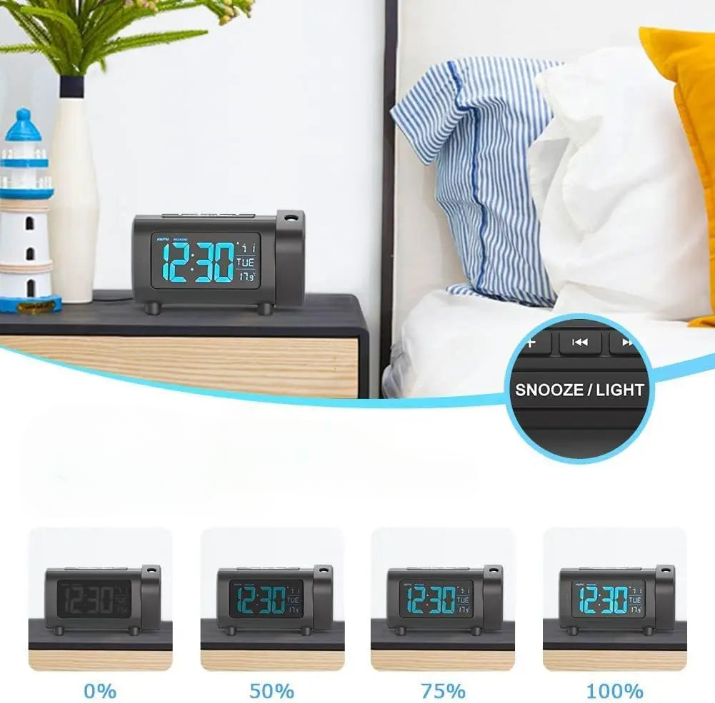 Træt af at fumle med telefonen om natten for at se klokken? Med vores innovative clockradio med projektor til loftet er de dage forbi! Denne smarte enhed projicerer tiden direkte op i loftet eller på væggen, så du nemt kan tjekke klokken uden at skulle dreje hovedet eller belaste øjnene med et skarpt display. Forestil dig at vågne blidt op og se tiden svæve diskret over dig – en perfekt start på dagen, hver dag.