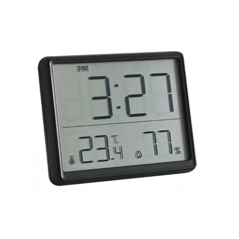 - **Tydeligt Digitalt Display:** Viser tid, temperatur (°C) og luftfugtighed (%) med store cifre.