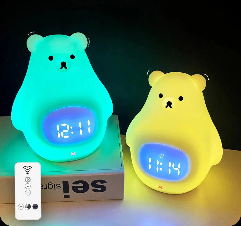Forvandl dit børneværelse til et magisk sted med vores super søde bjørne vækkeur, der også fungerer som en hyggelig natlampe! Dette alsidige ur er designet til at gøre sengetid og morgenrutiner sjovere og mere beroligende for dit barn. Den venlige bjørnefigur lyser op i forskellige farver, skaber en tryg atmosfære og hjælper de små med at falde i søvn. Med den medfølgende fjernbetjening er det super nemt at justere lys og indstillinger, selv fra sengen. Gør hver dag til en god dag med dette søde og funktionelle vækkeur!