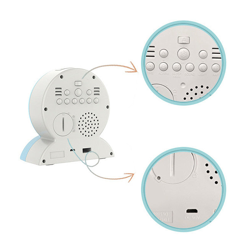 Vores søvntræner er designet til at gøre søvnrytmer simple og sjove for børn. Den store runde skærm viser en charmerende uglefigur, der er omgivet af himlen, som skifter fra en fredelig nattescene med måne og stjerner (når det er sovetid) til en lys og solrig dagscene med solen (når det er vågentid). Farverige lys, der gradvist skifter, efterligner solopgang og solnedgang, hvilket hjælper dit barns naturlige døgnrytme. Nederst på søvntræneren er der to små scener, der visuelt understreger forskellen på nat og dag – en sovende ugle om natten og en glad snegl under solen om dagen. Dette visuelle sprog er let for selv små børn at forstå, og giver dem uafhængighed i deres søvnvaner.