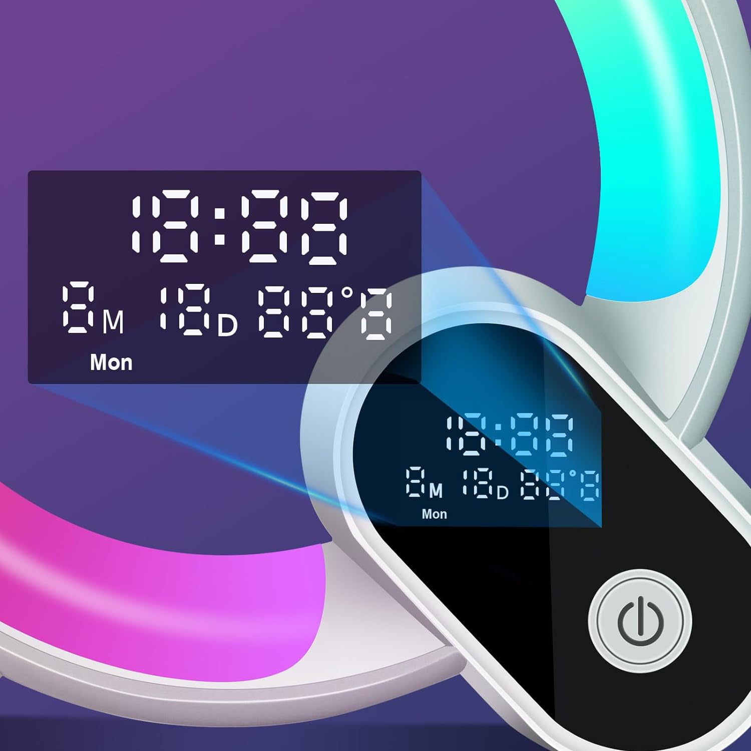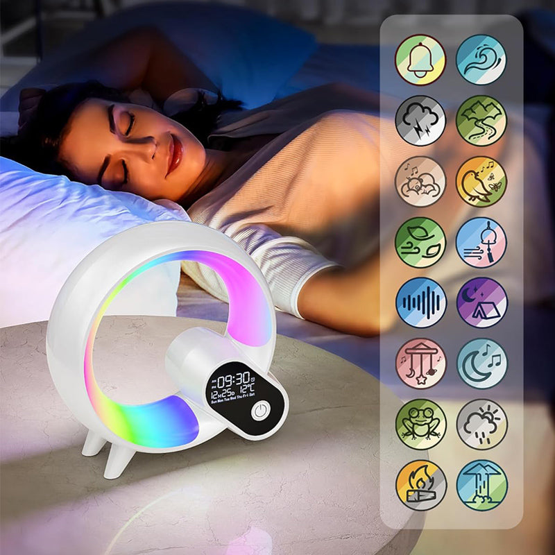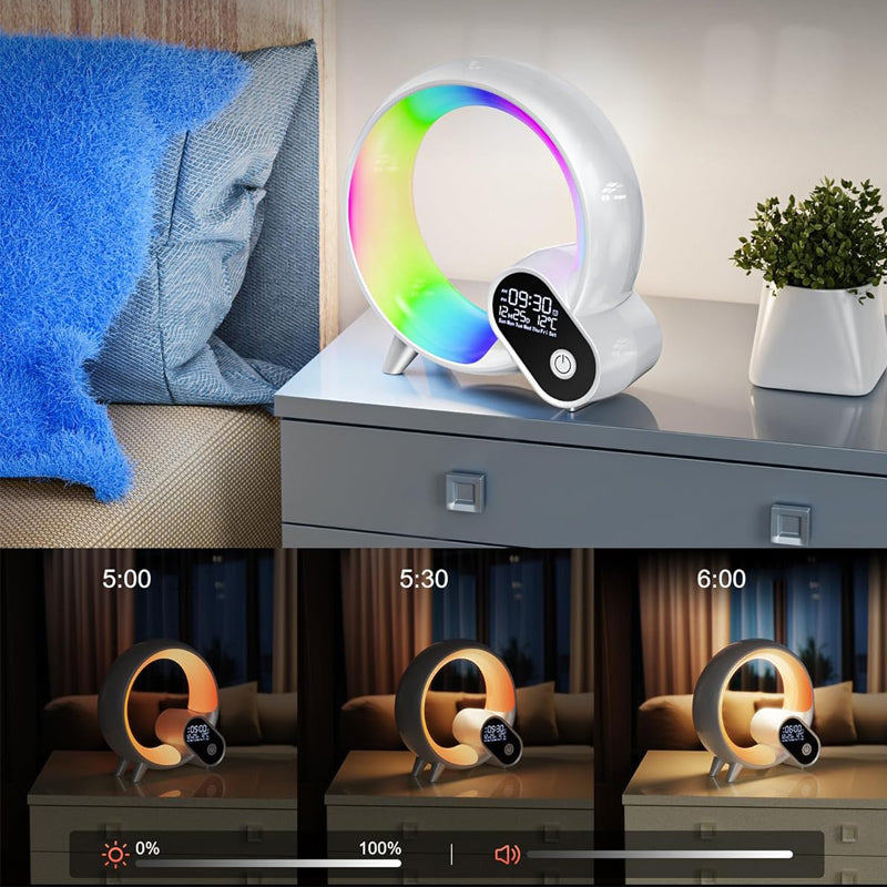 Forestil dig en morgen, hvor du vågner helt naturligt og roligt, uden et brat alarm. Vores innovative vækkeur med lys og beroligende naturlyde er designet til at give dig den bedste start på dagen. Det kombinerer en gradvis lyssimulering, der efterligner solopgangen, med en række beroligende naturlyde, der vækker dig på den mest behagelige måde. Glem alt om stressende morgener og omfavn en ny måde at starte dagen på, fyldt med energi og velvære. Det stilrene design med den farverige lysring passer perfekt ind i ethvert soveværelse.